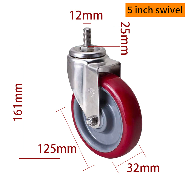 The EDL 5-Inch Stainless Steel Threaded Caster S545S-85 is a durable and versatile caster featuring a vibrant red TPU wheel. Designed with a stainless steel threaded stem, it allows for secure installation on a wide range of equipment. Each caster supports up to 150 kg, providing smooth, quiet, and stable movement even under heavy loads.Available in both swivel (with brake) and rigid versions, this caster is ideal for industrial trolleys, medical carts, laboratory instruments, and food service equipment. The TPU wheel offers excellent shock absorption, floor protection, and long-lasting durability, making it suitable for frequent use across different surfaces.The stainless steel construction ensures corrosion and rust resistance, allowing reliable performance in humid, chemical, or demanding environments. With its 5-inch wheel size, the caster enhances maneuverability and obstacle-crossing capability, combining strength, functionality, and a modern aesthetic. The EDL 5-Inch Threaded Red TPU Caster is a dependable solution for commercial, industrial, and laboratory applications.