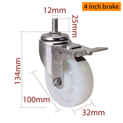 The EDL 4-Inch Stainless Steel Threaded Swivel/Brake Caster S544S-25 features a white nylon wheel designed for high wear resistance and long-lasting durability. With a stainless steel threaded stem, it ensures secure installation on a wide range of equipment. Available in swivel (with brake) and rigid versions, this caster supports up to 150 kg per wheel, delivering smooth, stable, and quiet movement.The nylon wheel is abrasion-resistant, low-maintenance, and capable of withstanding temperatures up to 120°C, making it ideal for industrial trolleys, medical carts, laboratory instruments, and food service equipment. Its neutral white color provides a professional and clean appearance suitable for any environment.Crafted with a stainless steel frame, the caster offers excellent corrosion and rust resistance, ensuring reliable performance even in humid or chemically challenging conditions. The 4-inch wheel size enhances maneuverability and obstacle-crossing capability, allowing effortless movement across various surfaces. The EDL 4-Inch Threaded White Nylon Caster combines strength, heat resistance, and durability, making it perfect for commercial, industrial, and laboratory applications.